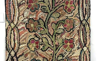 This is a lovely floral hooked rug with chain pattern around the outside. It has been mounted on a wood frame for hanging. There are a couple of small spots of loss, but overall is in good shape and has great colors.